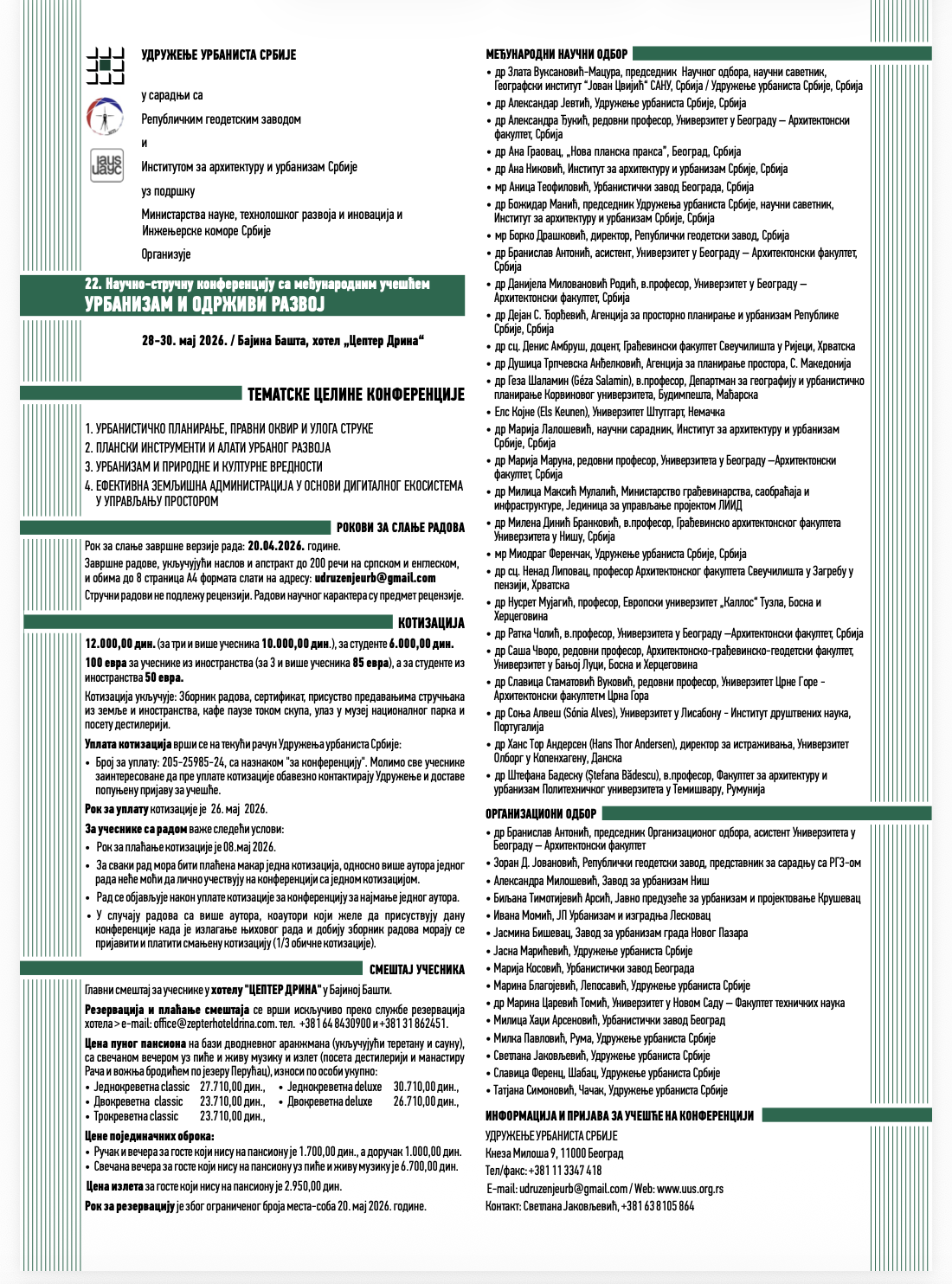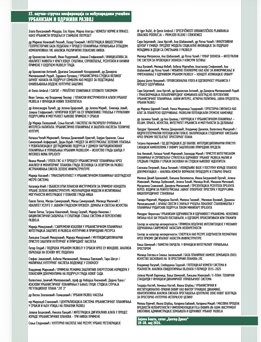"22. Naučno-stručnu konferenciju "Urbanizam i održivi razvoj sa međunarodnim učešćem", koja će se održati u Bajinoj Bašti, hotel „Zepter Drina“, od 28 do 30. maja 2026.godine.