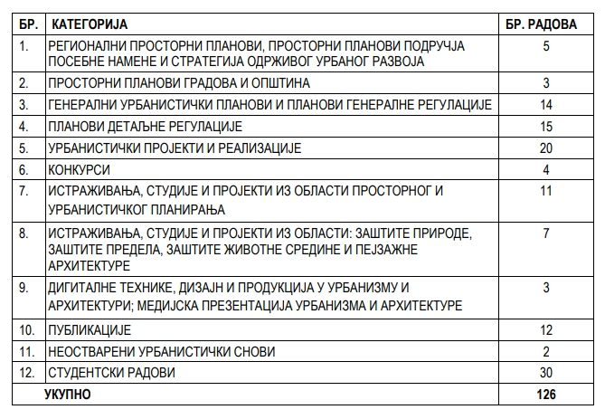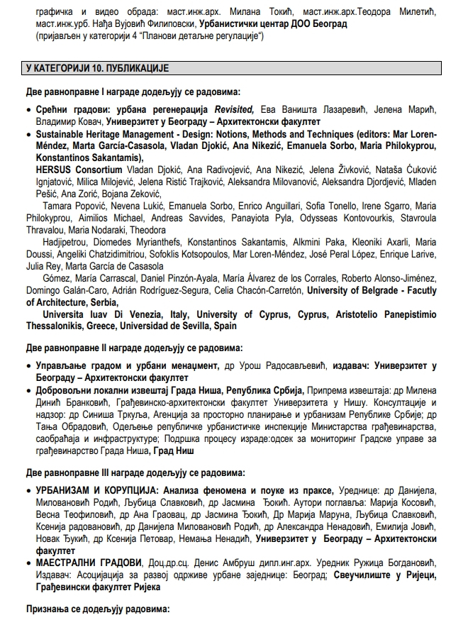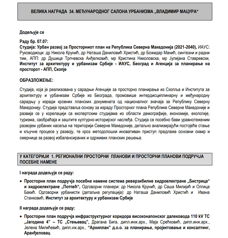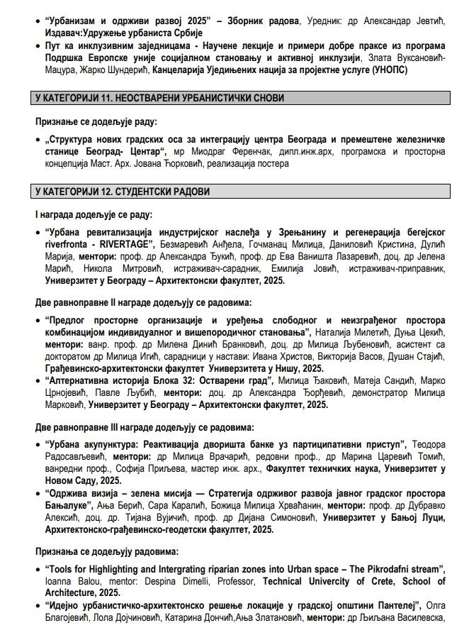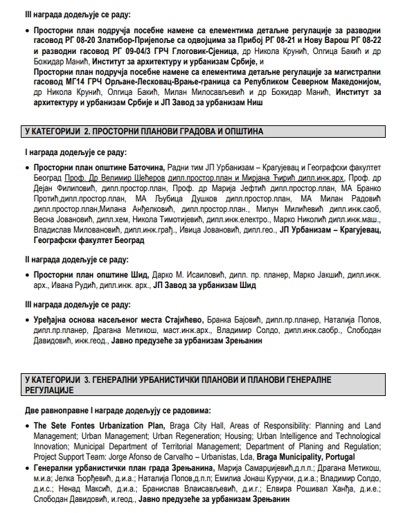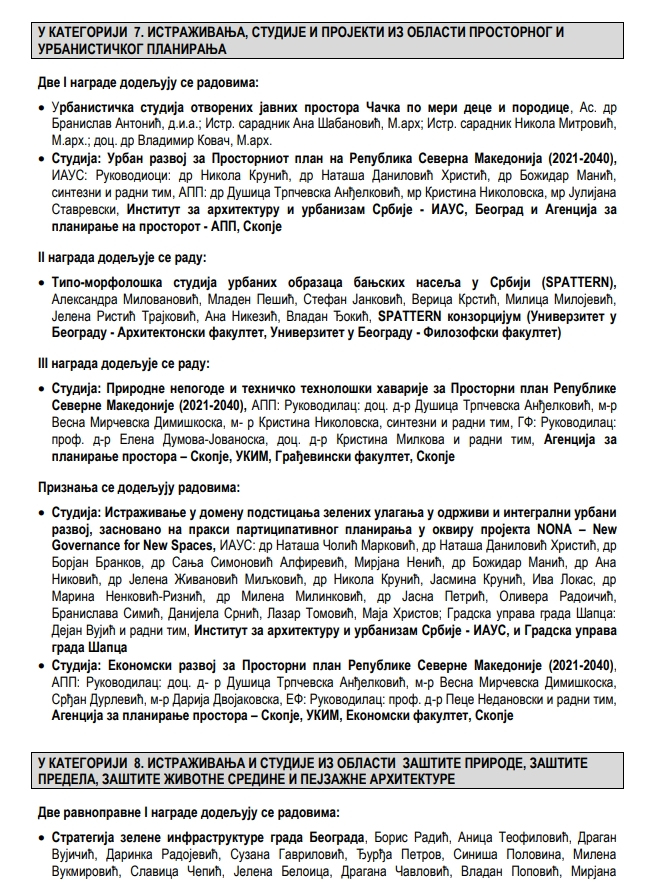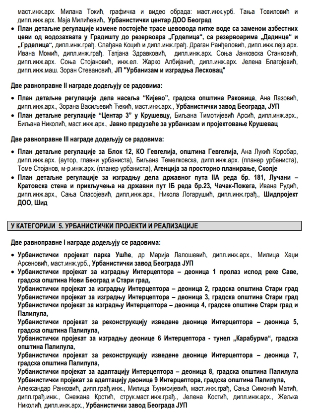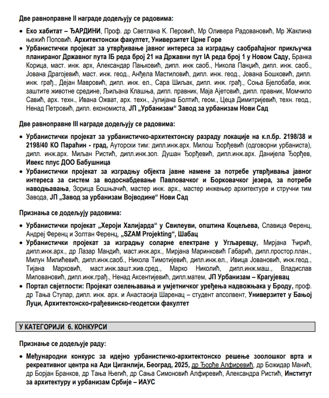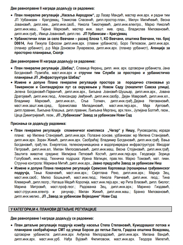 - Žiri je jedan rad iz kategorije br. 4 “Planovi detaljne regulacije“ prebacio u kategoriju br.9 “Digitalne tehnike, dizajn i produkcija u urbanizmu i arhitekturi; medijska prezentacija urbanizma i arhitekture“ zbog dobrog i inovativnog načina prezentovanja rada.