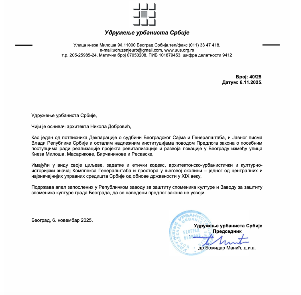 Kao jedan od potpisnika Deklaracije o sudbini Beogradskog Sajma i Generalštaba, i Javnog pisma Vladi Republike Srbije i ostalim nadležnim institucijama povodom Predloga zakona o posebnim postupcima radi realizacije projekta revitalizacije i razvoja lokacije u Beogradu između ulica Kneza Miloša, Masarikove, Birčaninove i Resavske,